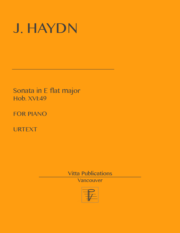This publication of Haydn’s piano sonata in E flat major Hob, XVI:49 reproduces the original music text-based on the urtext edition published by Karl Päsler in 1918. It also contains editor’s fingerings, some articulation signs, added only by a comparison with authentic indications that Haydn used in similar passages or phrases, and suggested dynamic marks, which are provided in small print.