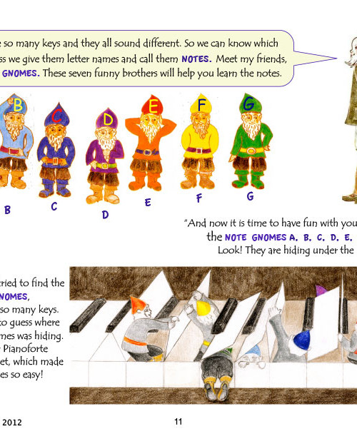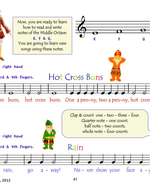 Carefully selected material is arranged in a strictly consistent order to promote the learning of essential for beginners piano playing skills. After completing the material of Book One students can execute different articulations: non legato, two-note slurs, staccato and legato. They can read notes in Treble and Bass clefs within 3 octaves (from great octave G to second octave G), rhythms, which include sixteenth notes and dotted quarter notes and play simple tunes with dynamics. The book is beautifully illustrated.